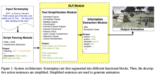 Automatically generating animation from natural language text finds application in a number of areas e.g. movie script writing, instructional videos, and public safety. How- ever, translating natural language text into animation is a challenging task. Existing text-to-animation systems can handle only very simple sentences, which limits their applications. In this paper, we develop a text-to-animation system which is capable of handling complex sentences. We achieve this by introducing a text simplification step into the process. Build- ing on an existing animation generation system for screenwriting, we create a robust NLP pipeline to extract information from screen- plays and map them to the system’s knowledge base. We develop a set of linguistic trans- formation rules that simplify complex sentences. Information extracted from the simplified sentences is used to generate a rough storyboard and video depicting the text. Our sentence simplification module outperforms exist- ing systems in terms of BLEU and SARI metrics.We further evaluated our system via a user study: 68% participants believe that our system generates reasonable animation from input screenplays.