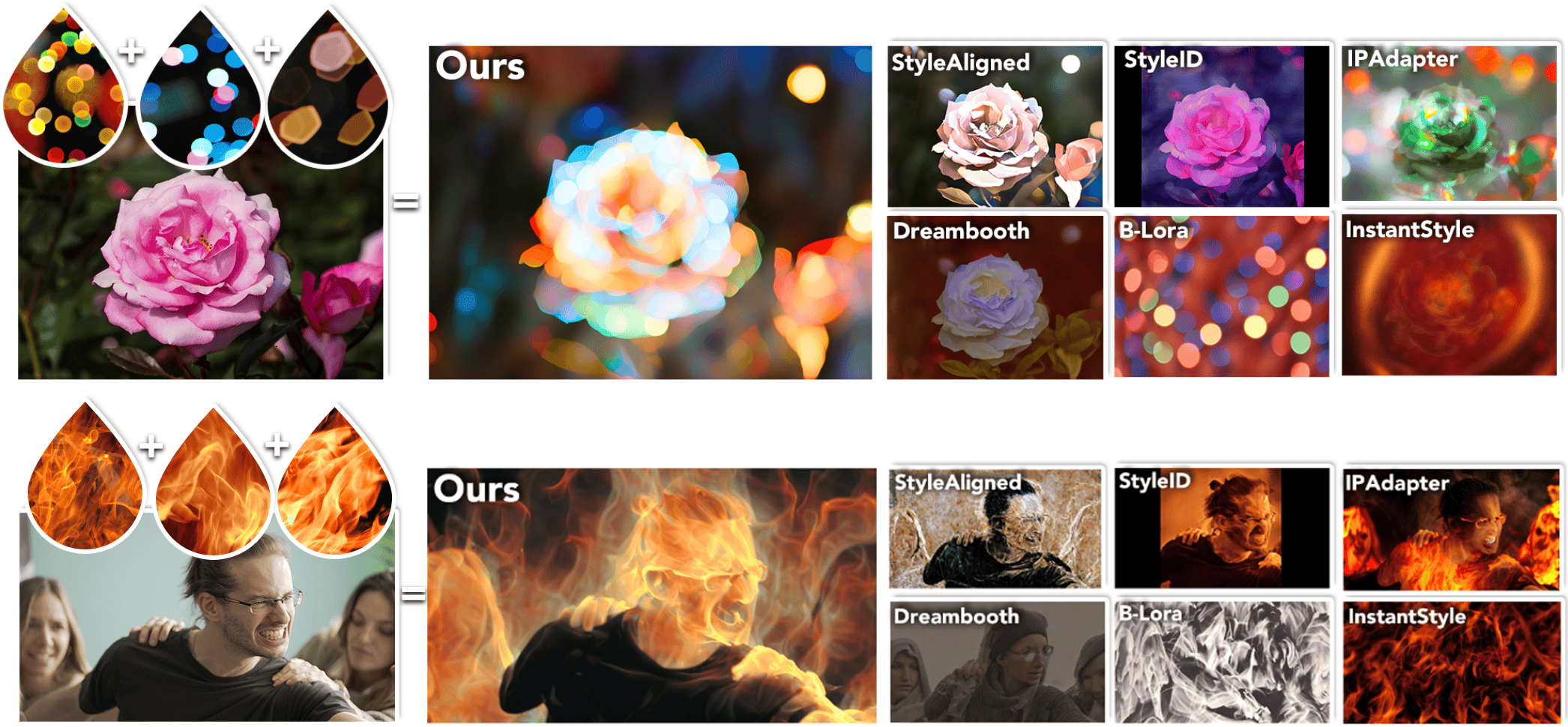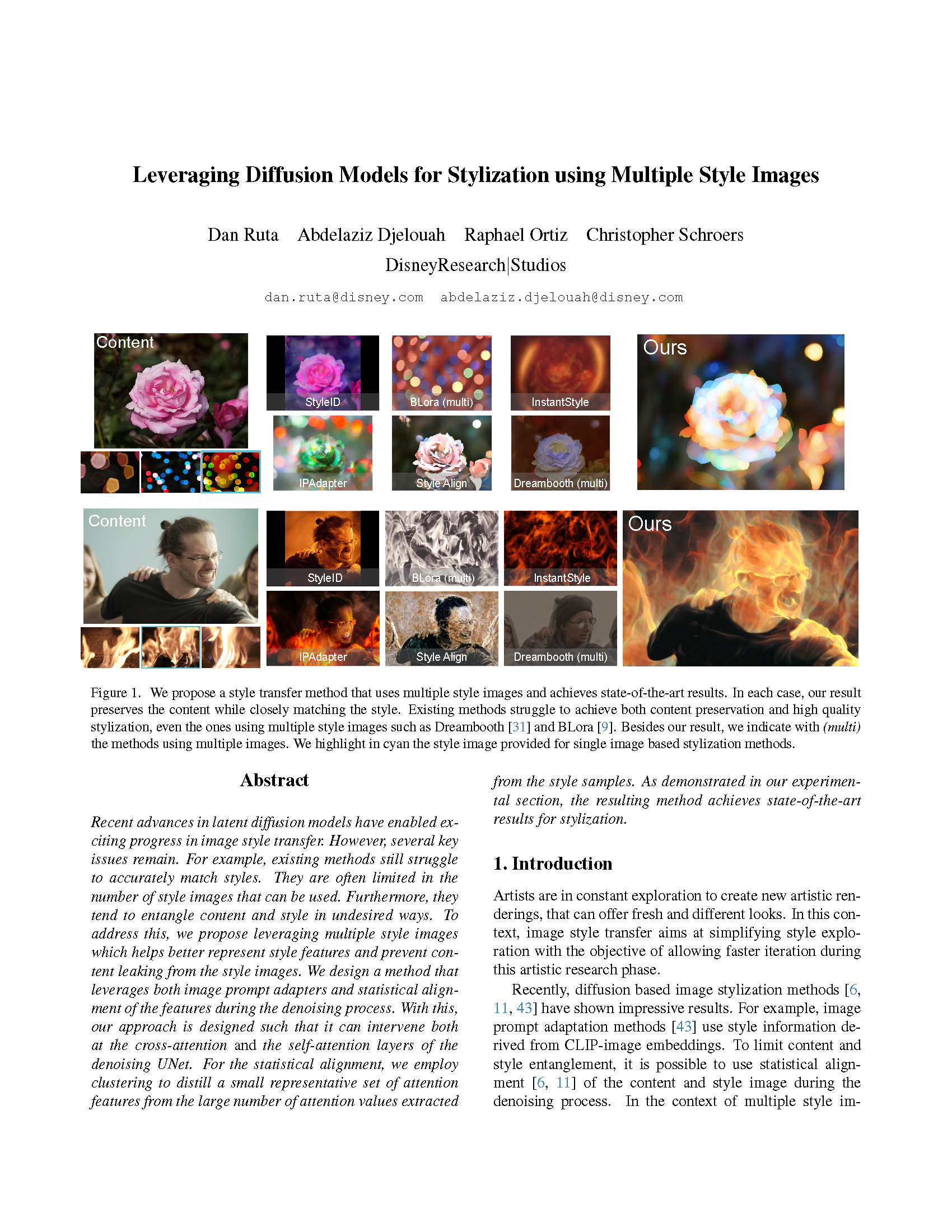 In this work, we propose leveraging multiple style images which helps better represent style features and prevent content leaking from the style images. We design a method that leverages both image prompt adapters and statistical alignment of the features during the denoising process.